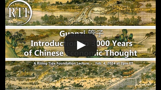 Guanzi is a nearly 3000 year old Chinese treatise that defines economics as “the study of making the country rich” which is still quoted by China’s leaders to this day. Join us for an afternoon we we transcend the lens of western-only understanding, read from original texts, and see what economics has always meant from a traditionally Chinese point of view.” The Rising Tide Foundation is a non-profit organization based in Montreal, Canada, focused on facilitating greater bridges between east and west while also providing a service that includes geopolitical analysis, research in the arts, philosophy, sciences and history. Consider supporting our work by subscribing to our substack page and Telegram channel at t.me/RisingTideFoundation. Also watch for free our RTF Docu-Series “Escaping Calypso’s Island: A Journey Out of Our Green Delusion.” You're currently a free subscriber to Rising Tide Foundation. For the full experience, upgrade your subscription. |