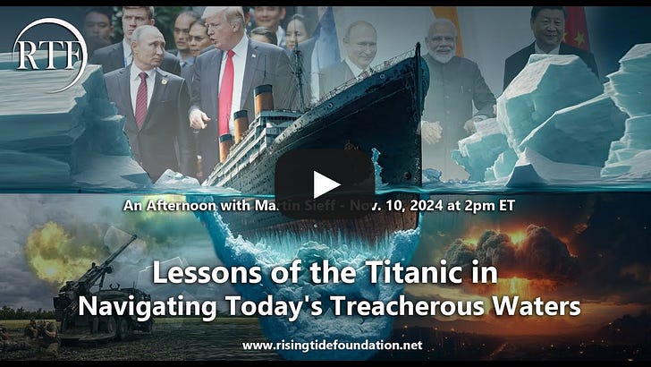 Martin Sieff delves into the multi-layered causes of the sinking of the Titanic with a look to navigating through dangerous waters in our present age. Pick up Martin Sieff’s books here: https://www.amazon.com/stores/author/…The Rising Tide Foundation is a non-profit organization based in Montreal, Canada, focused on facilitating greater bridges between east and west while also providing a service that includes geopolitical analysis, research in the arts, philosophy, sciences and history. Consider supporting our work by subscribing to our substack page. Also watch for free our RTF Docu-Series “Escaping Calypso’s Island: A Journey Out of Our Green Delusion.” You're currently a free subscriber to Rising Tide Foundation. For the full experience, upgrade your subscription. |