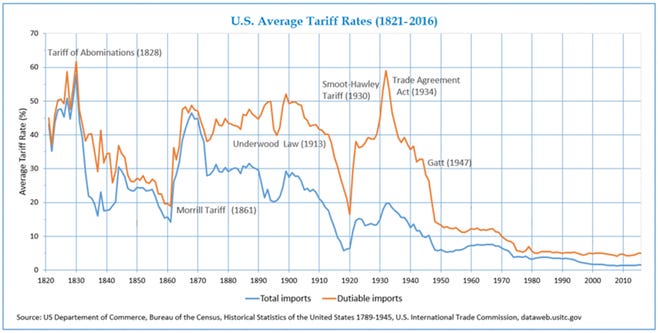 What Mathew Carey is stating here, is that protective tariffs may be in place, but if they are executed in a manner or level that renders them inefficient, and thus ineffective, it creates the same outcome then as if “trade had been allowed to regulate itself.” In other words, an inefficient tariff system services British free trade. We can see from the drastic plunge in protectionism under the presidencies of Jackson and Van Buren that this is exactly what happened. It rendered the protectionism that was put in place prior ineffective and was the same as if British free trade were allowed free reign over American industries. This is why it is concerning when Trump promotes Andrew Jackson as a president who was for protectionism, for this could not be more false, and calls into question whether Trump simply does not understand this, or is purposefully muddying the waters. Carey continues:[7]