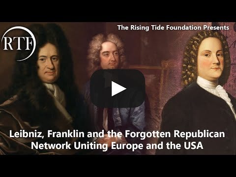 Dr. Uwe Alschner (historian and author of Never Again is Now Global) will continue this exploration of deep history with an investigation of the forgotten connection of republicanism between Europe and America shown by H Graham Lowry in his 1987 book ‘How the Nation Was Won’ featuring such forgotten heroes as Gottfried Leibniz, Jonathan Swift, and Benjamin Franklin (to name a few). Following the Venetian takeover of England culminating in the 1714 death of Queen Anne (and Queen Anne’s successor Electress Sophia of Hanover earlier that year), it became evident that the dreams of a republican Europe would not be realized as many had hoped. Although this drama has been scrubbed from history books, the fact is that none other than Gottfried Leibniz- the leading grand strategist of the republican movement of the 18th century was Sophia’s mentor and was positioned to become Prime Minister of England had she attained power. Instead of this positive outcome, a Hellfire Club pawn named King George I took power instead, and European history moved in a much darker direction. Uwe will explore these battles and will focus on the connections between European and American conspirators with a look towards our present crisis-ridden age. Subscribe to Uwe’s Substack:Supplementary reading/viewing:How the Nation Was Won by Graham Lowry HG Lowry, Anton Chaitkin, The Anti-Newtonian Roots of the American Revolution Philip Valenti, The Anti-Newtonian Roots of the American Revolution (1995) Michelle Rasmussen, Bach, Mozart, and the ‘Musical Midwife’ (2001) David Shavin, Mozart and The American Revolutionary Upsurge (1992) Edward Spannaus, Leibniz, Halle, and The American Revolution (2003) The Rising Tide Foundation is a non-profit organization based in Montreal, Canada, focused on facilitating greater bridges between east and west while also providing a service that includes geopolitical analysis, research in the arts, philosophy, sciences and history. Consider supporting our work by subscribing to our substack page and Telegram channel at t.me/RisingTideFoundation. Also watch for free our RTF Docu-Series “Escaping Calypso’s Island: A Journey Out of Our Green Delusion.” You're currently a free subscriber to Rising Tide Foundation. For the full experience, upgrade your subscription. |