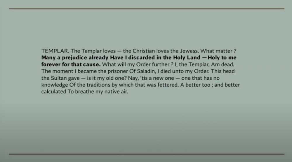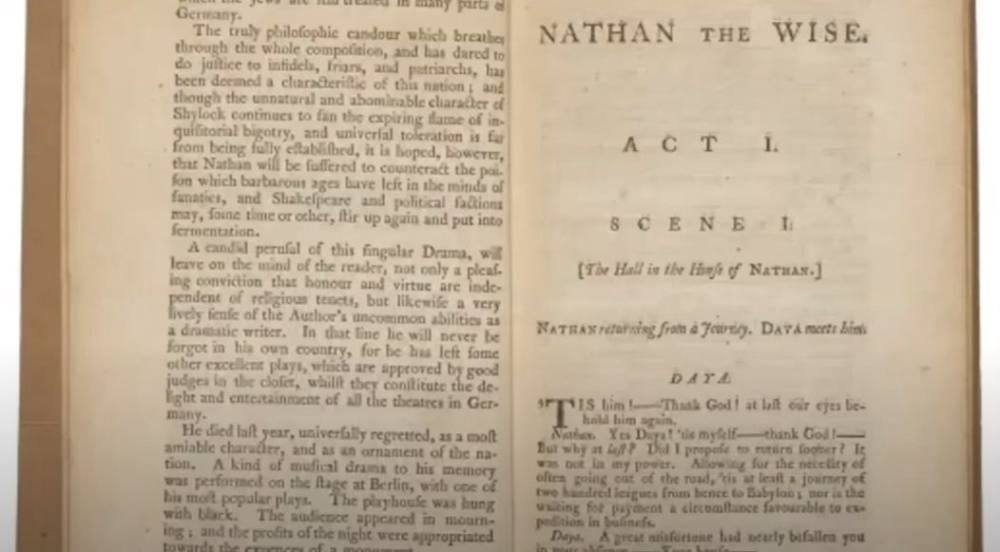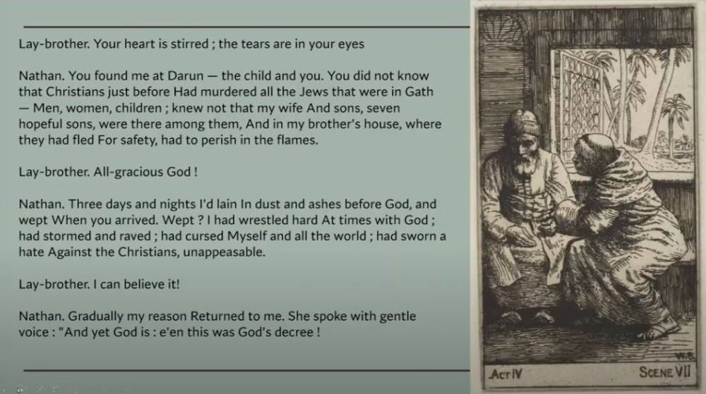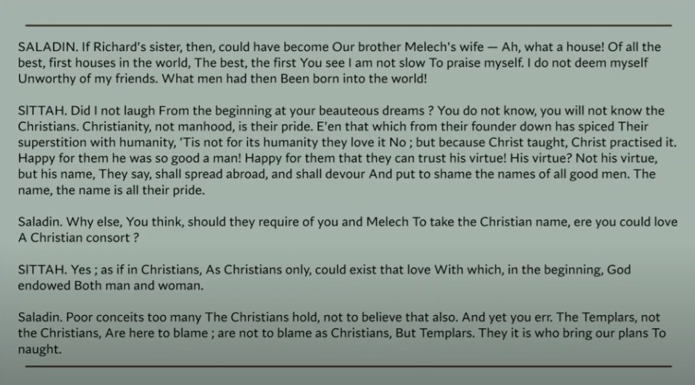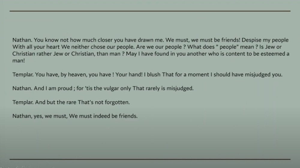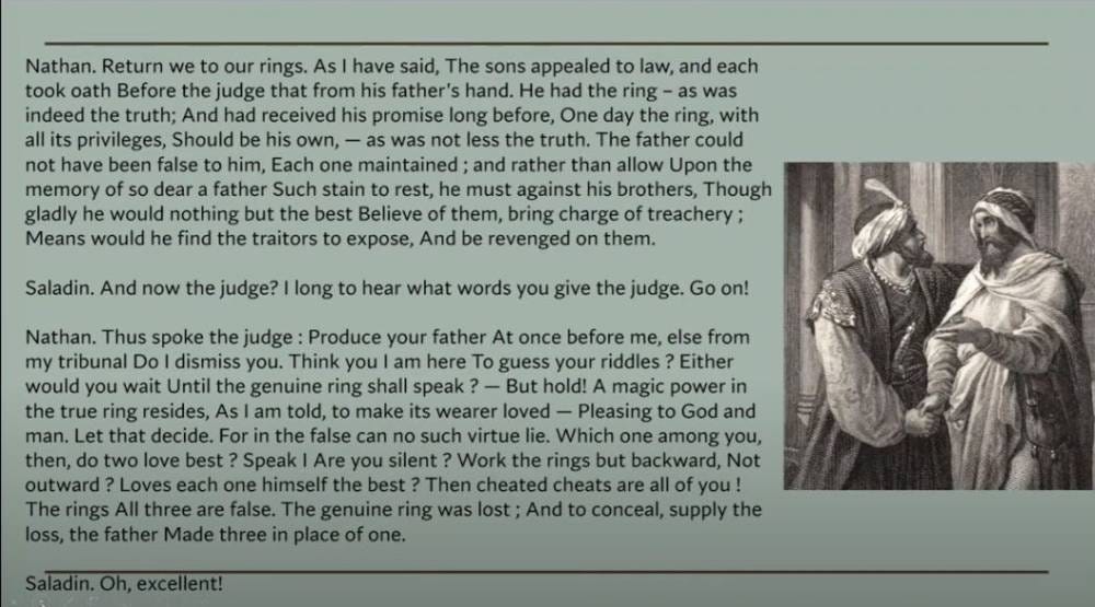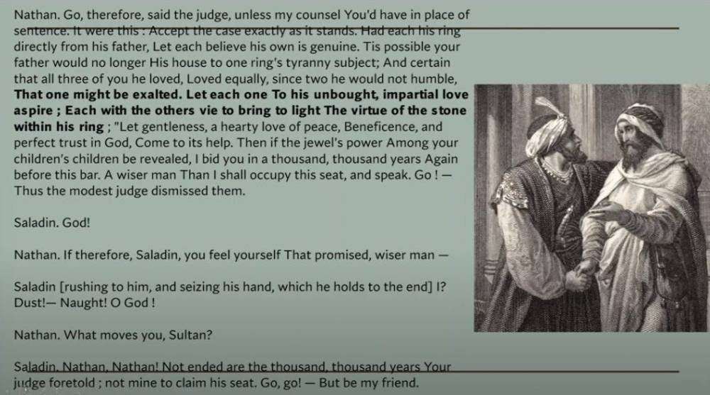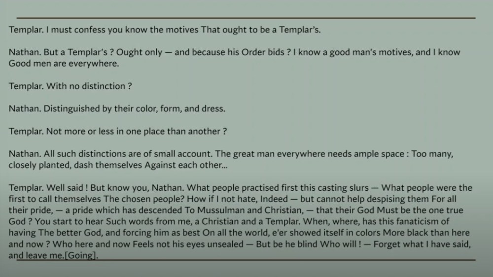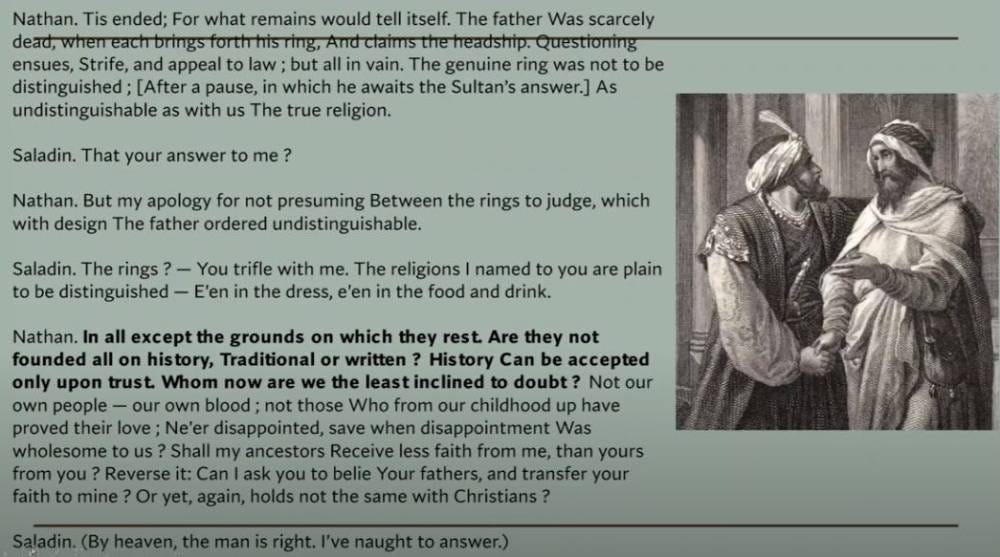 By Cynthia Chung[This is a transcript of an RTF lecture I delivered in January 2023.] For those who are not aware of who is Gotthold Lessing, I will speak of him as a person and his contribution to German culture later on, but he is considered the father of German classical literature. And “Nathan the Wise” for those who are not aware is centered in Jerusalem, the Holy Land, overlapping with the period of the Third Crusade. “Nathan the Wise” is a play, or what Lessing called a “poetic drama” that centers around the story of Nathan (who is a Jew), a Templar and Saladin. Saladin is the Sultan and holds jurisdiction of Jerusalem at this point. The Templar’s life has been spared, the only Templar to be spared by Saladin. Thus, there is this question of, with all of these three religions meeting in the Holy Land, what is the ultimate fate of humankind and is there really one religion in particular that deserves to call the Holy Land their own. And so, I think I am just going to share some, what I think are, key aspects of the dialogue, because as Matt said, I do want to talk about a lot of other things outside of this play, however, it is important that people get a bit of a refresher or an introduction to the play. One of the key conversations, which I chose to take out of this play is with Saladin and his sister Sittah. King Richard, who is the King of England at this time and is the one who kind of instigates the Third Crusade, Saladin says in reference to him: People should be aware that Saladin was an actual person and had captured Jerusalem from the Crusaders. He actually had the reputation of being a very merciful and benevolent ruler of Jerusalem. Saladin had captured almost every Crusader city. ‘Saladin preferred to take Jerusalem without bloodshed and offered generous terms, but those inside refused to leave their holy city, vowing to destroy it in a fight to the death rather than see it handed over peacefully. Jerusalem capitulated to his forces on Friday, 2 October 1187, after a siege. When the siege had started, Saladin was unwilling to promise terms of quarter to the Frankish inhabitants of Jerusalem. Balian of Ibelin threatened to kill every Muslim hostage, estimated at 5,000, and to destroy Islam’s holy shrines of the Dome of the Rock and the al-Aqsa Mosque if such quarter were not provided. Saladin consulted his council and the terms were accepted. The agreement was read out through the streets of Jerusalem so that everyone might within forty days provide for himself and pay to Saladin the agreed tribute for his freedom. An unusually low ransom was to be paid for each Frank in the city, whether man, woman, or child, but Saladin, against the wishes of his treasurers, allowed many families who could not afford the ransom to leave. Patriarch Heraclius of Jerusalem organised and contributed to a collection that paid the ransoms for about 18,000 of the poorer citizens, leaving another 15,000 to be enslaved. Saladin’s brother al-Adil “asked Saladin for a thousand of them for his own use and then released them on the spot.” Upon the capture of Jerusalem, Saladin summoned the Jews and permitted them to resettle in the city.’ [1] So there is a period of peace due to Saladin’s benevolent rule and even King Richard puts forward the offer “How about you marry my sister?” the idea being that they would both rule over the Holy Land together. This promise had a lot of potential, as Saladin is bringing up in Lessing’s dialogue, what a world that would have been if this had worked out, but the problem with King Richard’s offer was that he was saying that Saladin would have to convert to Christianity anyway. So in the end, it wasn’t really much of a peace offering since that would basically put Saladin against his own people. In the story of “Nathan the Wise”, the Templar has been freed by Saladin (all other captured Templars were executed) and it is because the Templar reminds Saladin of his long lost brother, even though the Templar is much younger then the age his brother would be. Nonetheless, Saladin is very moved when he sees him and he spares his life. And so this Templar is just sort of wandering around in Lessing’s play, he is separated from the other Templars, but he is also going through what you could say an existential crisis. And Nathan, who is a Jewish merchant, he returns to Jerusalem from his voyage collecting a whole bunch of beautiful items, and finds out that the Templar has saved the life of his daughter. The house was on fire, for whatever reason, and the Templar rushed in and saved her only to realise afterwards that she was Jewish and the Templar doesn’t want anything to do with the family because of that. But Nathan wants to give thanks for saving his daughter’s life. Nathan thanks the Templar for saving his daughter’s life, even though she does not practice his faith, the Templar responds with: So the Templar is remarking that Nathan knows well the sort of chivalrous “honor code” of knights. Nathan responds with the question, should you only do honorable things if your Order bids it? There is a clear insinuation here to Christianity more broadly as well, do you only act to save a life because you know it would be regarded favourably by your religion. Nathan goes on to bring up the fact that there are good men everywhere, and they do not need to be a part of a Knights’ Order or Christian in order to be deemed so. However, the Templar is convinced of his superiority to those outside these groupings, he feels ever more convinced of it after his experience in the Holy Land. Nathan responds with: This is going to be a theme, the central theme of Lessing’s “Nathan the Wise” that we are first humans, we are first what you could call humane, before we are a citizen of a country, or a practicer of a religion, and it is this human bond that universally unites us. A citizen of a country, or a practicer of a religion w